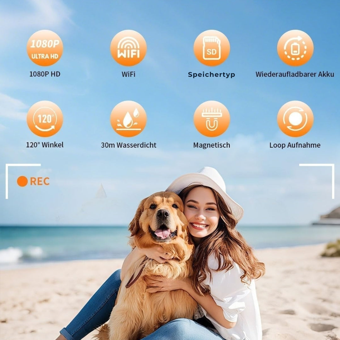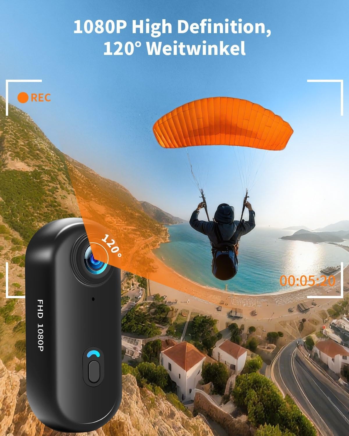 Klein aber kraftvoll: Full HD 1080P, 120° Weitwinkel und WiFi-Streaming aufs Smartphone. Komplettes Starter-Set mit 64GB Speicherkarte und allen Halterungen inklusive – keine versteckten Kosten.